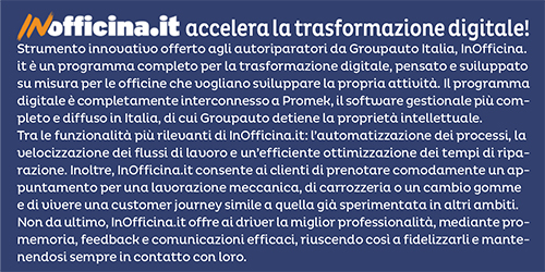 Inoltre, per permettere all’officina di supportare il proprio cliente anche quando la sua auto o veicolo commerciale non è in manutenzione, è stato creato InOfficina.it, programma di trasformazione digitale per officine. Ad orientare maggiormente le attività di Groupauto Italia è dunque lo sviluppo delle tecnologie automotive. Digitalizzazione, elettrificazione, nuove tecnologie a bordo delle auto e accesso ai dati sono le parole chiave della strategia presente e futura di Groupauto Italia, che poggia già su solide basi grazie a programmi e progetti che anticipano l’automotive che verrà.