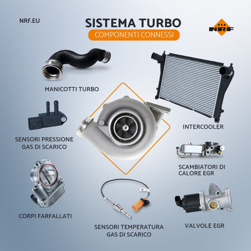 Un turbocompressore non opera mai da solo: fa parte di un sistema turbo composto da intercooler, manicotti turbo, valvole e raffreddatori EGR, sensori dei gas di scarico e molti altri componenti che influenzano direttamente prestazioni e durata. NRF conosce questo ecosistema a fondo e offre tutti i prodotti necessari per garantire un funzionamento armonico, efficiente e affidabile.